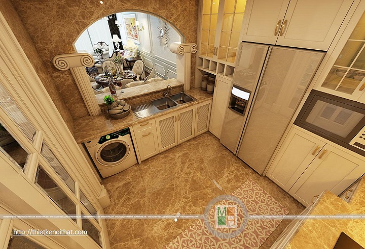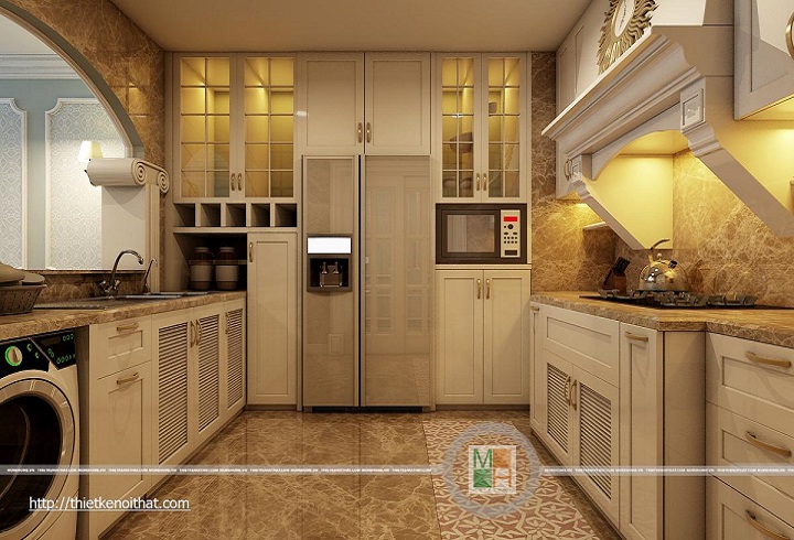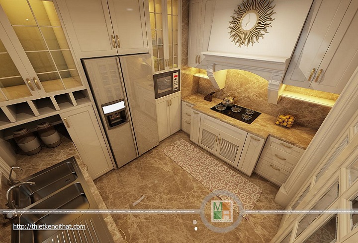Phong cách cổ điển quý phái bởi kiến trúc sư MoreHome đã tạo nên vẻ đẹp vô cùng ấn tượng cho không gian nội thất. Cùng với tay nghề cao của đội ngũ kiến trúc sư cũng như chất liệu cao cấp của chất liệu tủ bếp gỗ tự nhiên đã tạo nên sản phẩm vô cùng sang trọng.