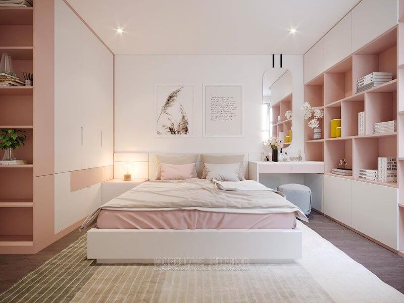 Hệ thống tủ gỗ Acrylic thiết kế âm tường, tạo khu vực lưu chưa đồ lớn, phù hợp diện tích phòng ngủ nhỏ