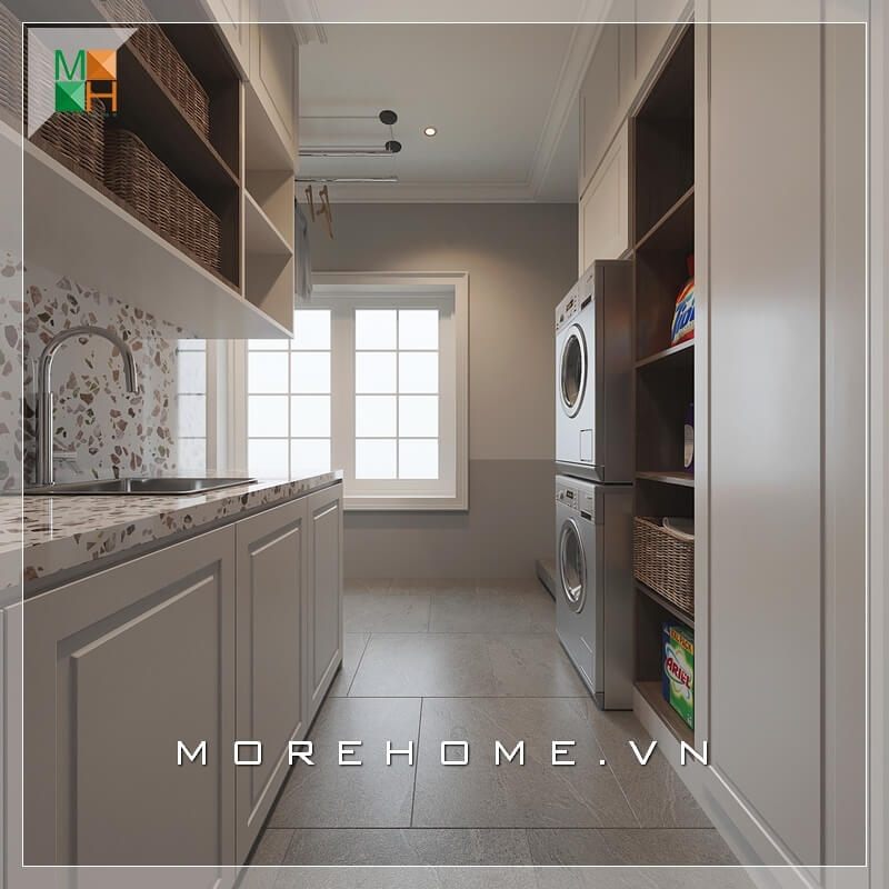 Không gian phòng bếp được kiến trúc sư thiết kế kiểu dáng chữ u kết hợp bàn bar bếp giúp không gian bếp được tách biệt tạo cảm giác sang trọng, tiện nghi cho người nội trợ