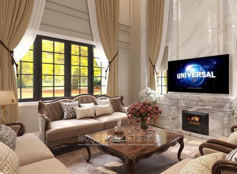 Thiết kế bàn trà gỗ óc chó đẹp luôn là điểm nhấn ấn tượng cho phòng khách tân cổ điển với đường tinh tế, họa tiết sắc nét không bị mai một theo thời gian.