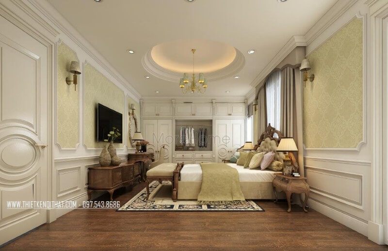 Lựa chọn giấy dán tường cho phòng ngủ với họa tiết tân cổ điển giúp cho bức tường không bị thô cúng mà còn sang trọng hơn.