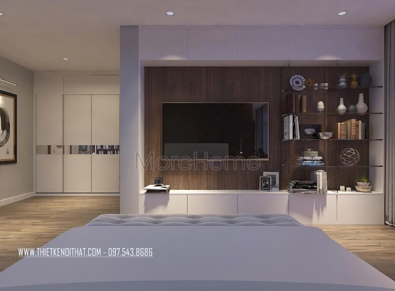 Mặt trong của kệ ti vi gia chủ lựa chọn giấy dán tường giả gỗ để bức tường không bị thô cứng