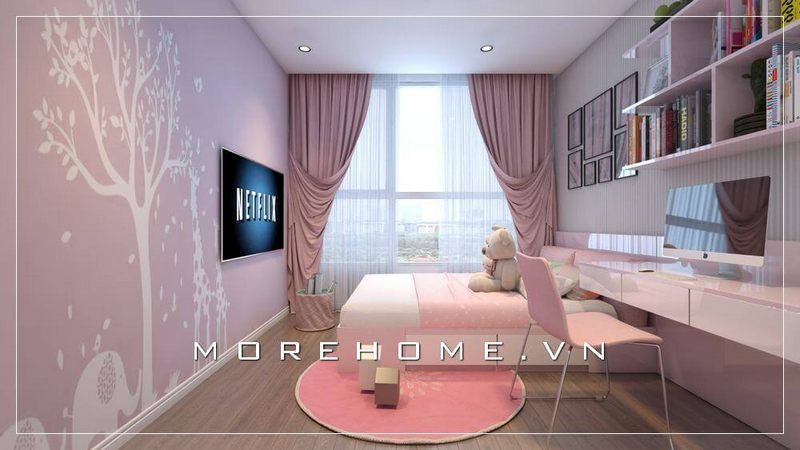 Bức tường được trang trí với giấy dán tường màu hồng cùng họa tiết cây lá tạo điểm nhấn độc đáo cho phòng ngủ của bé gái
