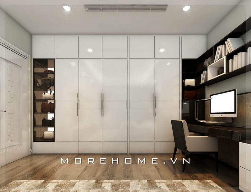 Tủ quần áo màu trắng gỗ công nghiệp hiện đại tích hợp phần kệ tủ lưu trữ sách tiện dụng hơn cả