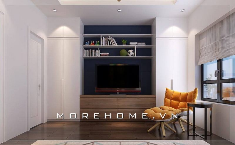 Sự kết hợp hài hòa giữa tủ quần áo và kệ ti vi đa năng mang đến cho căn phòng chật chội trở nên thoáng đãng hơn cả