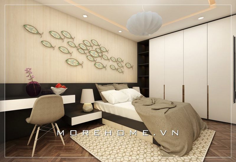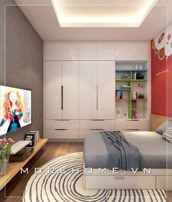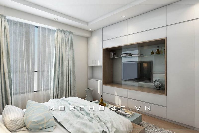 Sự kết hợp hoàn hảo giữa tủ áo và kệ tivi, tinh tế và không nhàm chán, cánh cửa lùa phù hợp với phòng ngủ chung cư, làm cho không gian phòng ngủ thoáng và cảm giác rộng hơn rất nhiều