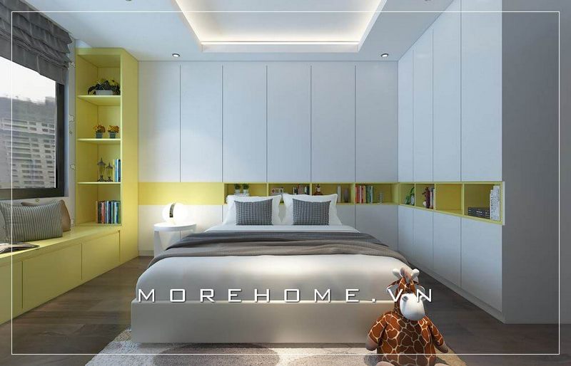 Tủ áo hiện đại tích hợp với kệ sách luôn là xu hướng được đông đảo khách hàng lựa chọn, gam màu trắng nhẹ nhàng mang lại cảm giác tinh tế, ấn tượng hơn cho cả không gian phòng ngủ trẻ em