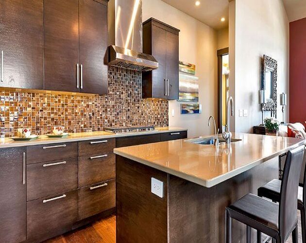 Sử dụng đá nhân tạo để làm ốp bàn bếp, quầy bar sẽ giúp tạo nên không gian bếp chung cư an toàn và thẩm mỹ.