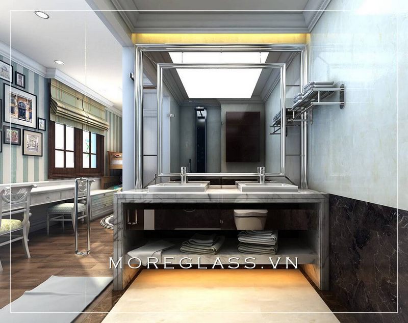 Mẫu gương hình chữ nhật đẹp với đường viền độc đáo đã làm nên một điểm nhấn cho khu rửa tay của nhà hàng.