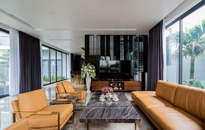 Bàn trà mặt đá đẹp inox mạ vàng cung cấp cho phòng khách căn biệt thự một vẻ đẹp sang trọng và độc đáo.