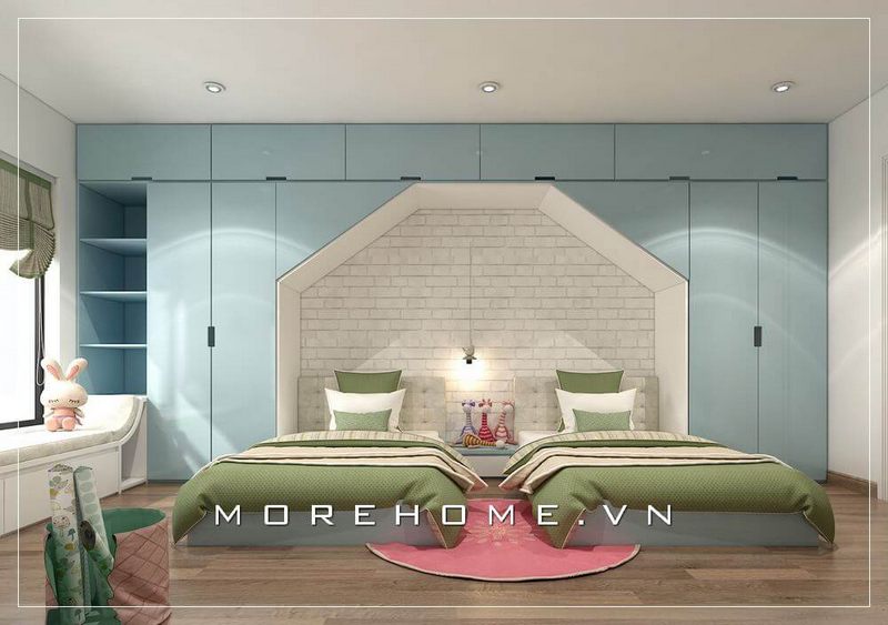 Mẫu giường ngủ trẻ em có thiết kế từ gỗ công nghiệp, màu xanh nhẹ nhàng và thanh nhã.